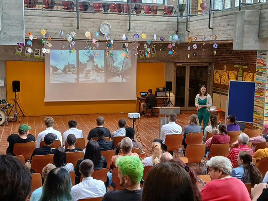 Das Rahmenprogramm wurde von den Schülern selbst gestaltet: Ein mitreißendes Schlagzeugsolo, die rhythmische Darbietung der Trommelgruppe und eine beeindruckende kreative Aufführung zum Musikstück Die Moldau sorgten für Begeisterung im Publikum und unterstrichen die vielfältigen Talente unserer Schülerschaft.